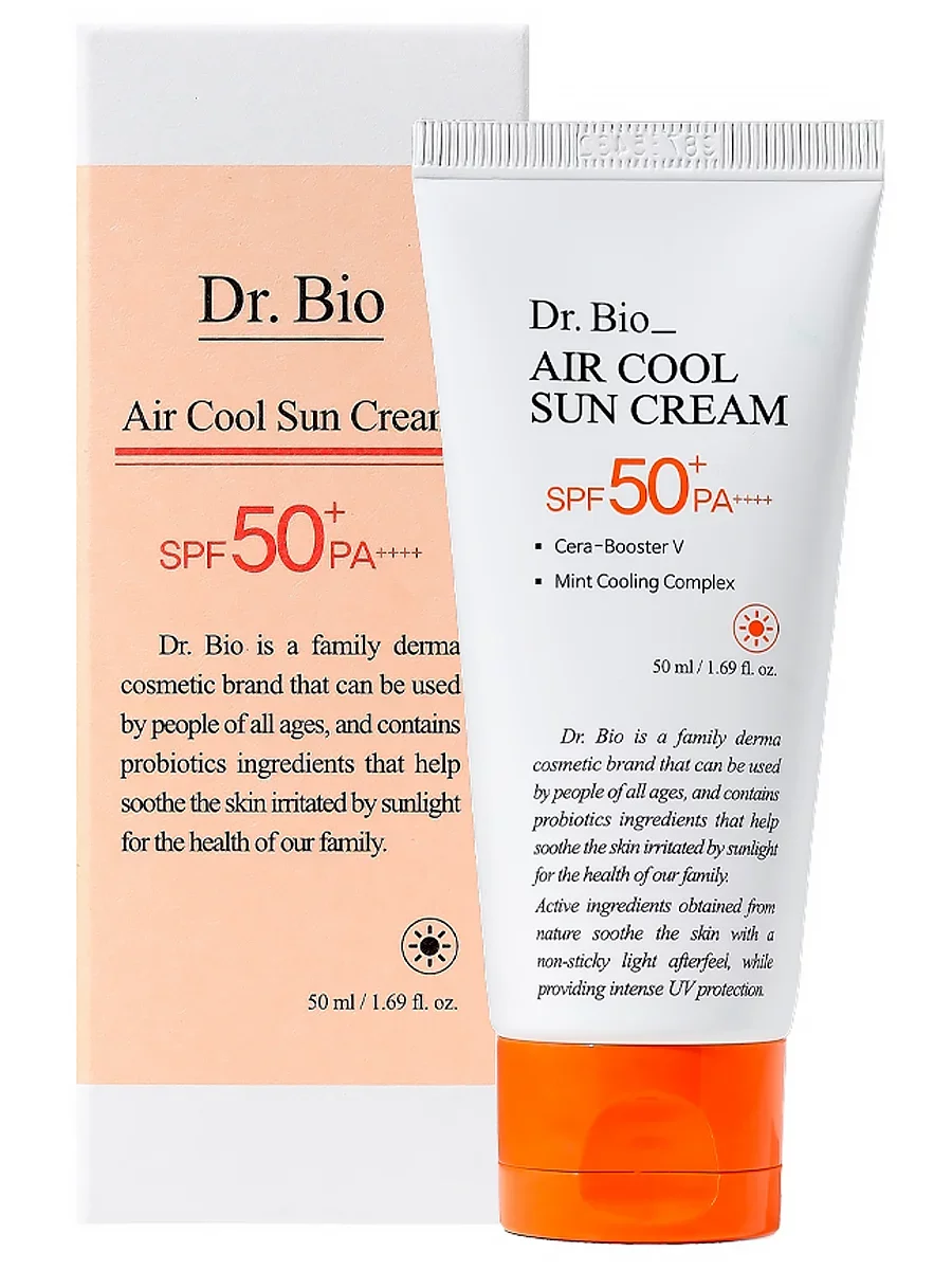 Охлаждающий солнцезащитный крем-эссенция DR.BIO AIR COOL SUN CREAM SPF50+ обеспечивает надежную защиту от ультрафиолетового излучения и HEV-света, предотвращает фотостарение, оказывает охлаждающий эффект и мгновенно успокаивает раздражения, снимает красноту и зуд, в том числе после пребывания на солнце.