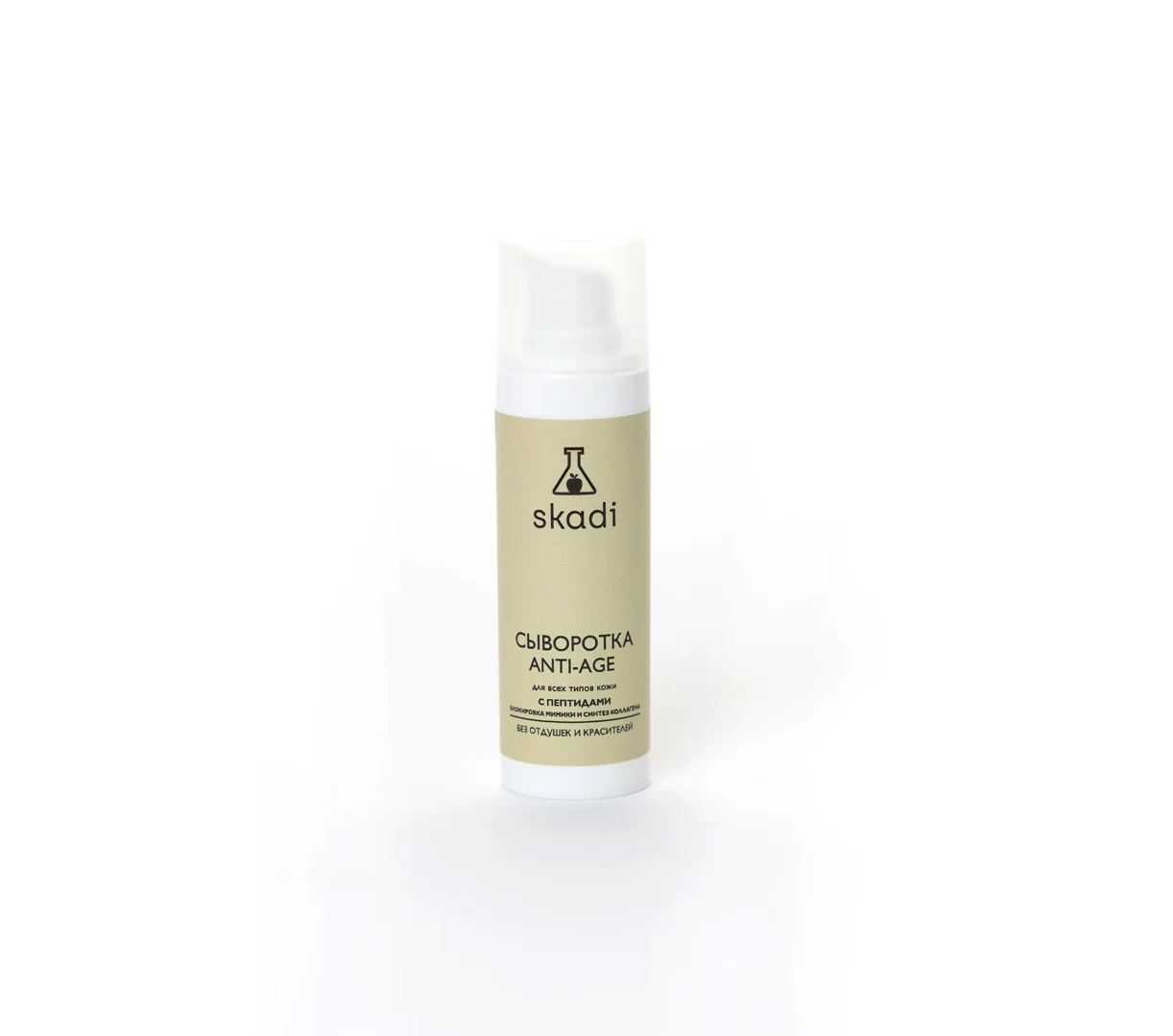 Лаконичная сыворотка SKADI ANTI-AGE SERUM WITH PEPTIDES направленного действия с пептидами в высокой дозировке.