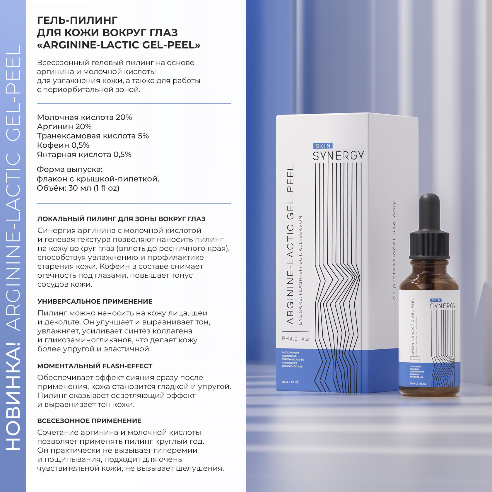 SKIN SYNERGY Arginine-Lactic Gel-Peel — это всесезонный гелевый пилинг, созданный на основе аргинина и молочной кислоты, который эффективно увлажняет кожу и подходит для работы с чувствительными зонами, включая периорбитальную область и интимные участки. Его гелевая текстура и мягкое действие делают процедуру комфортной и безопасной для различных типов кожи.