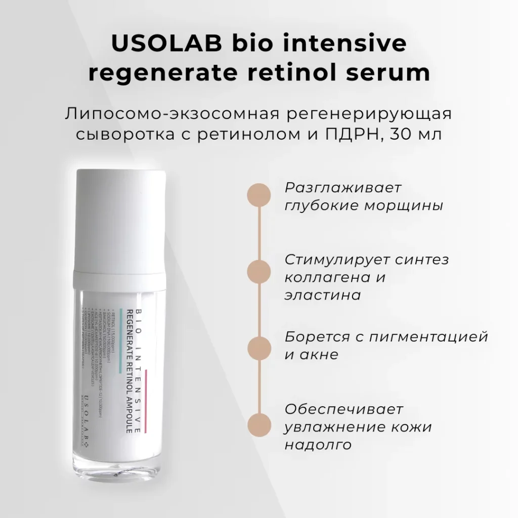 USOLAB BIO INTENSIVE REGENERATE RETINOL CREAM — это мощный регенерирующий крем с ретинолом 1,5% и ПДРН 5%, созданный для продвинутых пользователей. Этот крем разработан для глубокого воздействия на кожу, предоставляя комплексное решение проблем старения, таких как морщины, дряблость и потеря упругости. С уникальными активными компонентами, он способствует активному восстановлению кожи, противодействует свободным радикалам и стимулирует выработку коллагена и фибрина, обеспечивая глубокий лифтинг эффект.
