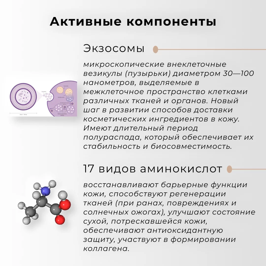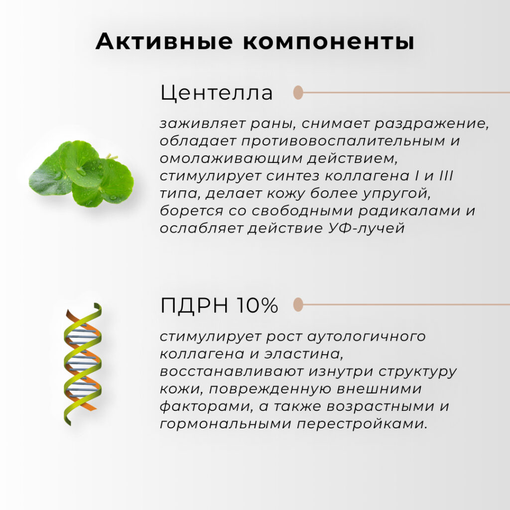- ПДРН 5% (Полидезоксирибонуклеотид) — оказывает выраженное регенеративное действие, значительно повышает эластичность кожи, способствует её восстановлению после повреждений и стимулирует клеточное обновление.