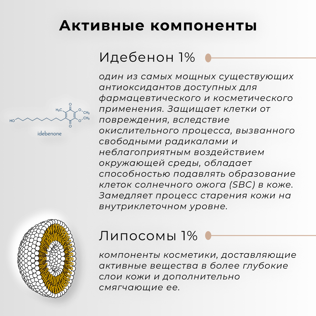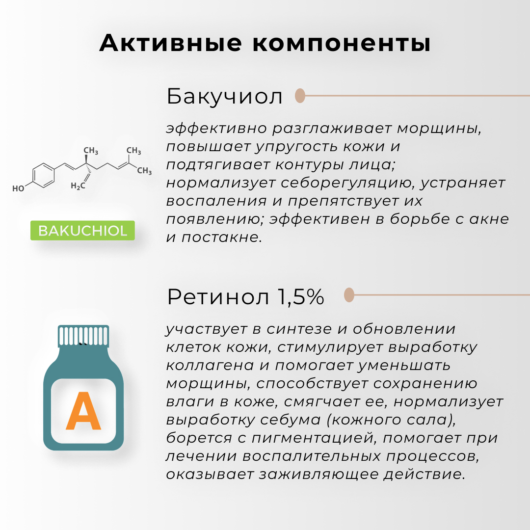 - Ретинол 1,5% — мощный антивозрастной ингредиент, который способствует отшелушиванию ороговевшего слоя кожи, улучшает текстуру и выравнивает тон, помогает разглаживать морщины и стимулирует выработку коллагена.
