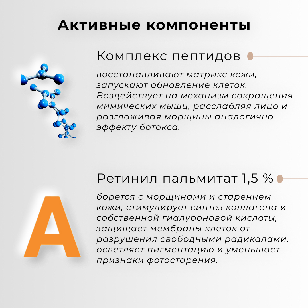 - Acetyl Hexapeptide-8 — известен как "ботокс в банке", расслабляет мимические мышцы, снижает выраженность динамических морщин и способствует разглаживанию статических морщин.