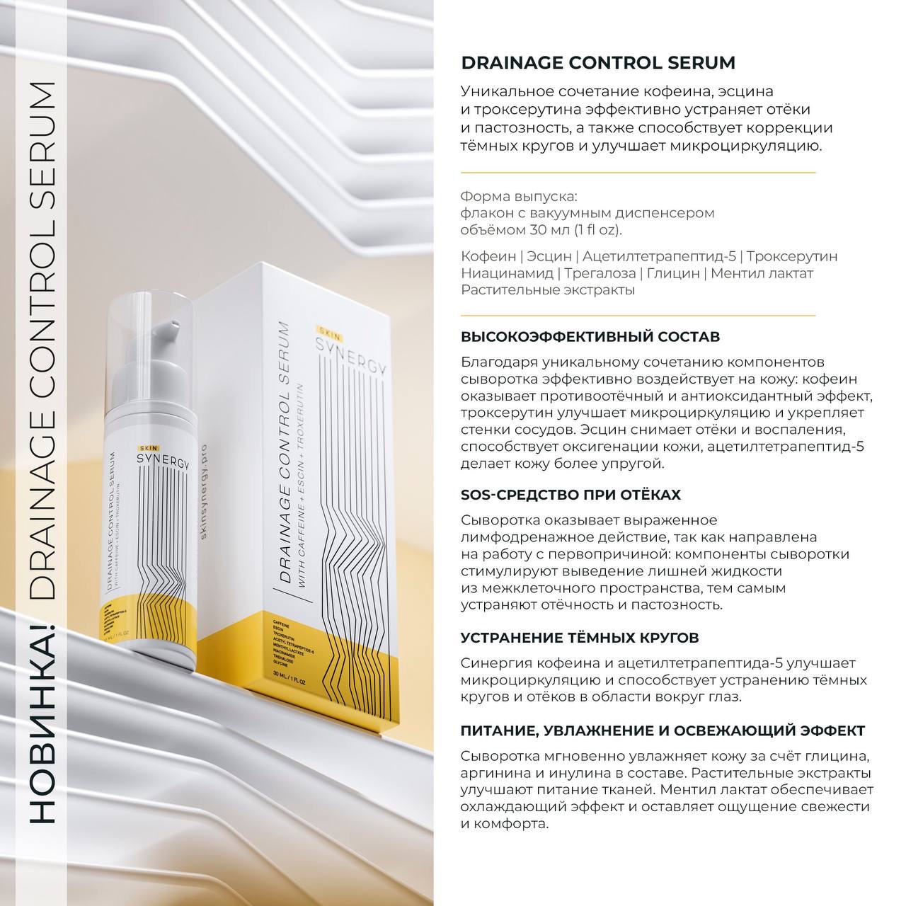 SKIN SYNERGY DRAINAGE CONTROL SERUM сыворотка предназначена для ухода за кожей с любым типом себосекреции, эффективно борется с отёками и пастозностью, а также помогает в коррекции тёмных кругов под глазами. Благодаря уникальному сочетанию активных компонентов, сыворотка восстанавливает кожу, укрепляет сосудистые стенки и улучшает микроциркуляцию, что помогает избавиться от застойных явлений и накопления лишней жидкости в тканях.